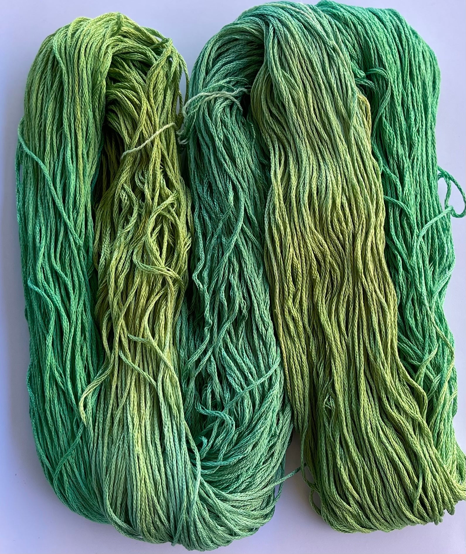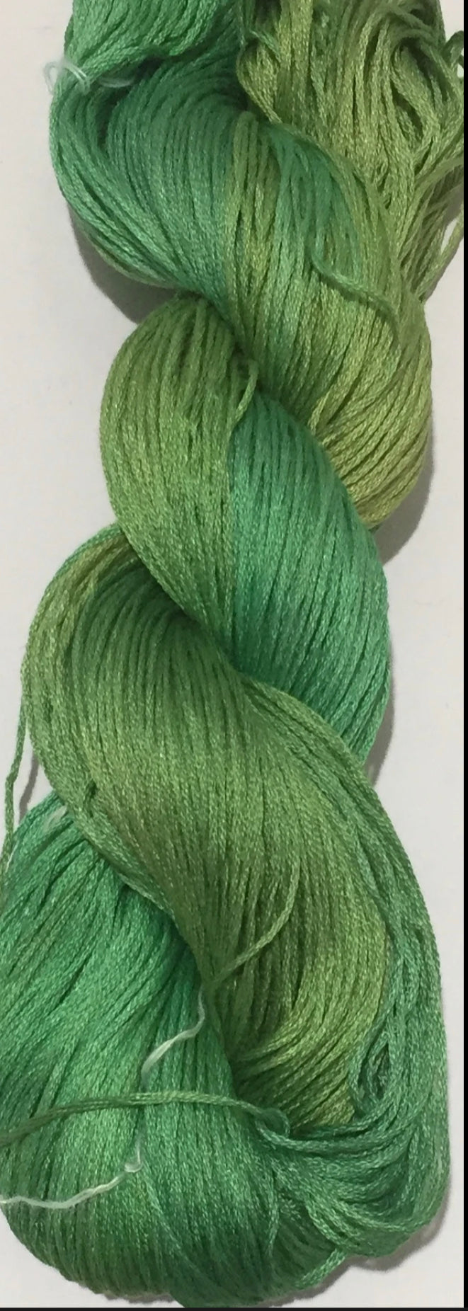 This hank is a variegated brighter greens. Because this silk is so shiny, the differences in colour are often exaggerated in the photo. If you have any questions, please ask.