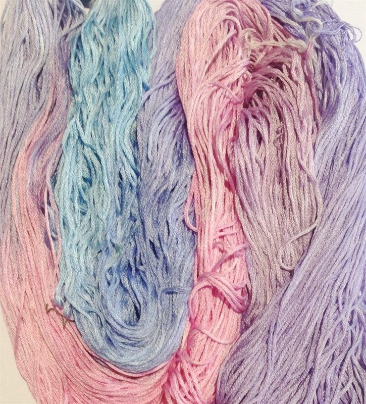 This hank is a soft variegated with pink, purple, violet, blue. Because this silk is so shiny, the differences in colour are often exaggerated in the photo. If you have any questions, please ask.