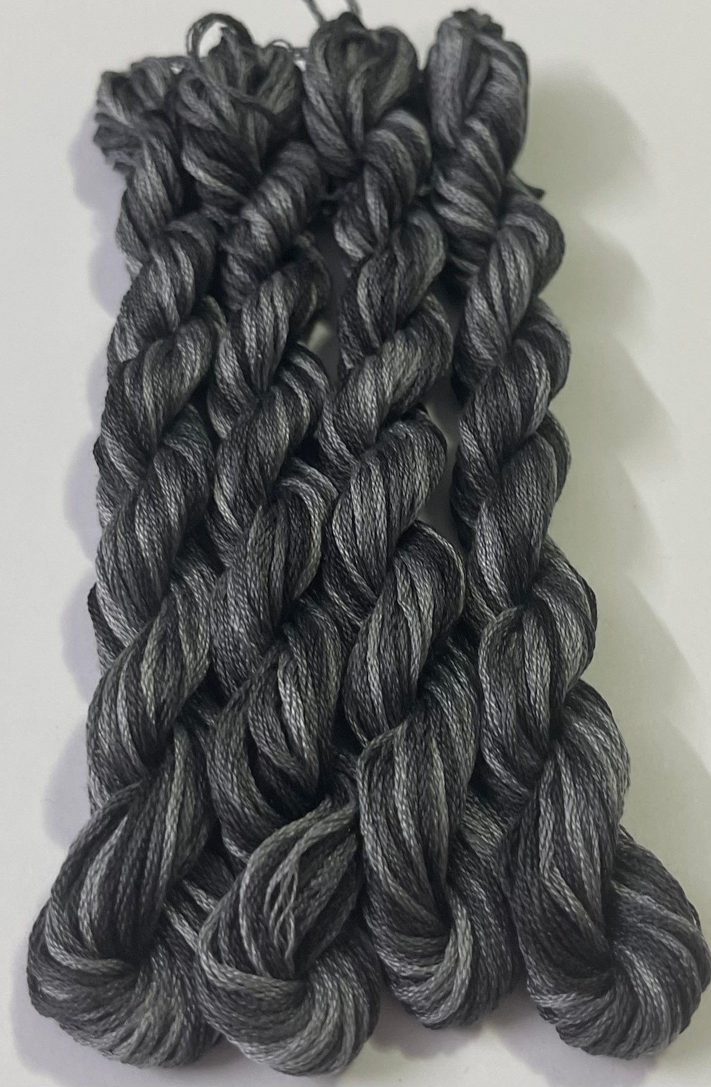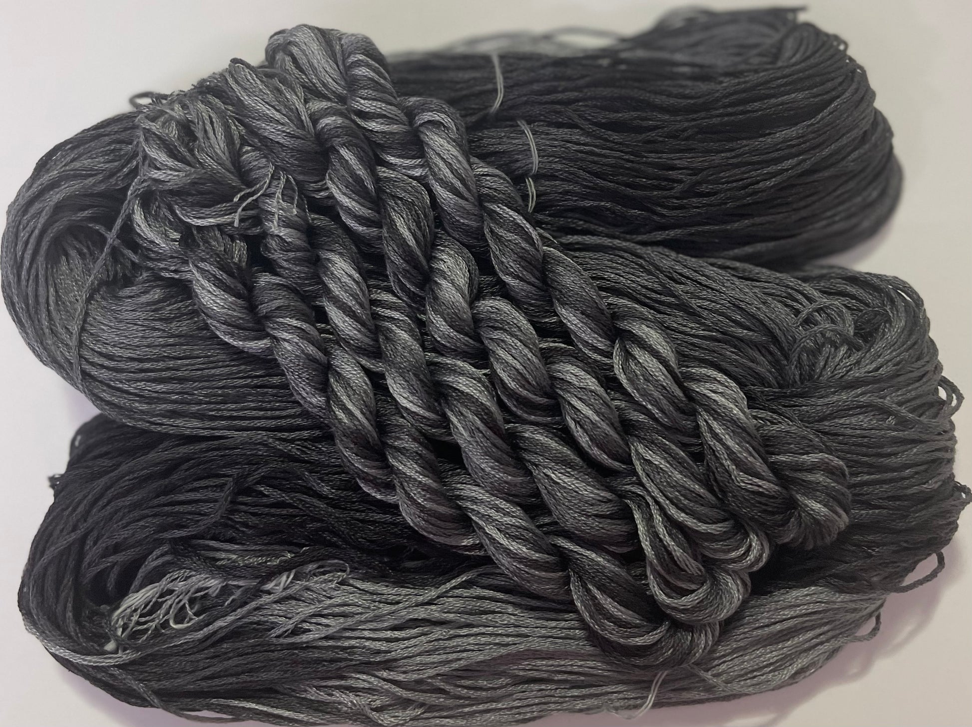 This hank is a combination of black, charcoal and dark grey. Because this silk is so shiny, the differences in colour are often exaggerated in the photo. If you have any questions, please ask.