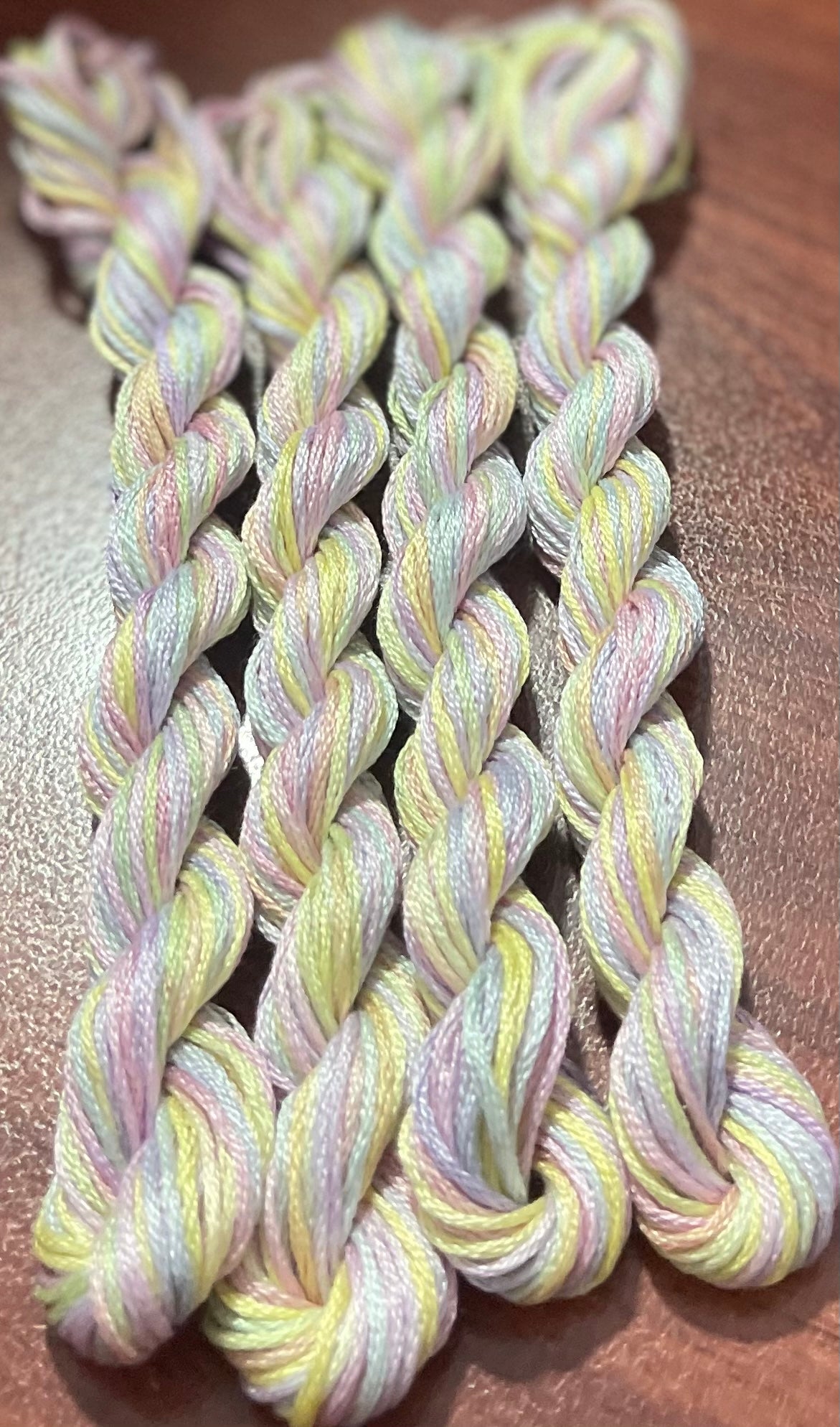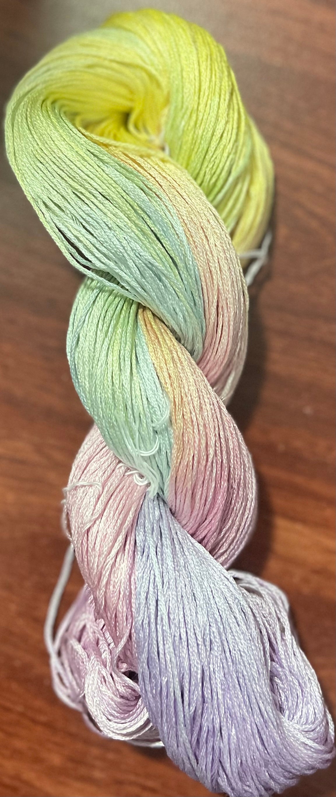 This a beautiful Hank of pastel colours. Because this silk is so shiny, the differences in colour are often exaggerated in the photo. If you have any questions, please ask.